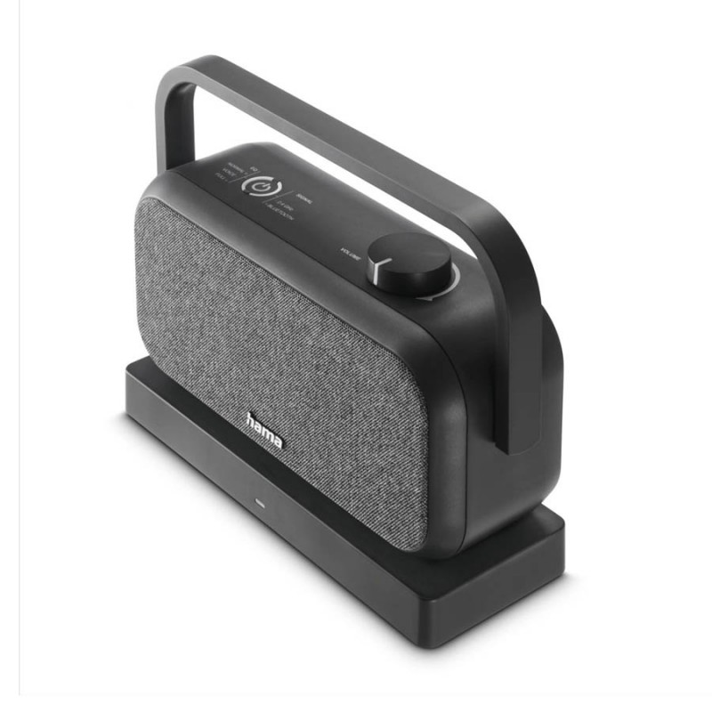 - elegantní provedení s textilním povrchem, velkým regulátorem hlasitosti a pohyblivým držadlem