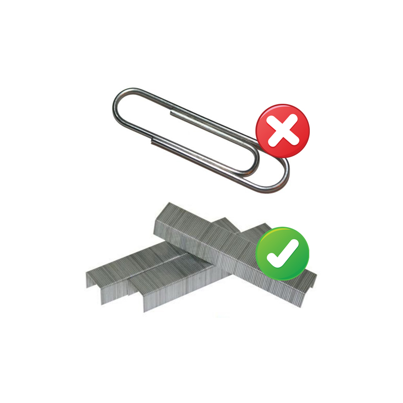- vysoce kvalitní nože vyrobené z oceli si poradí i se sešívacími sponkami; sešívací sponky spojí listy papíru trvale, nejde o kancelářské sponky pro dočasné sepnutí listů papíru (viz obrázek v galerii obrázků)